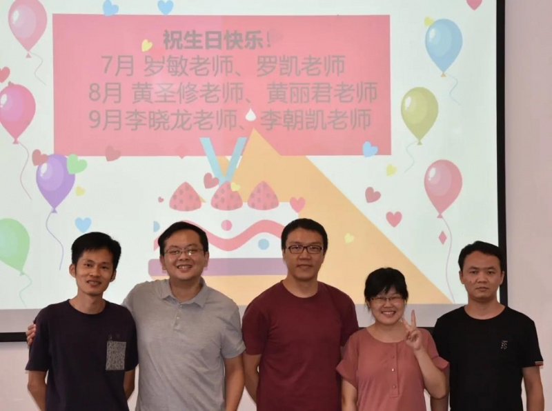教师生日会随后举行,黄圣修、黄丽君、罗敏、李晓龙、李朝凯与罗凯六位老师收到了全体教师的生日祝福。