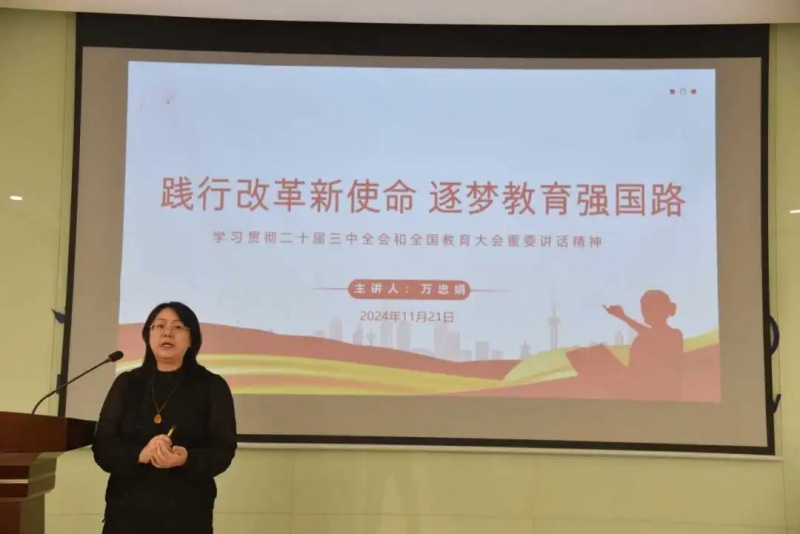 11月21日,万忠娟书记在海琴6号A326面向全体党员主讲党课,以“践行改革新使命,逐梦教育强国路”为主题,引领全体党员深入学习了二十届三中全会和全国教育大会精神。党课正式开始前,万书记就“为何要上党课?为何要参与组织生活?”进行了深刻阐述。她强调,组织生活是加强党性修养的必经之路,是提高理论水平的关键途径,同时也是增强党的执政能力、构建学习型政党的重要要求。