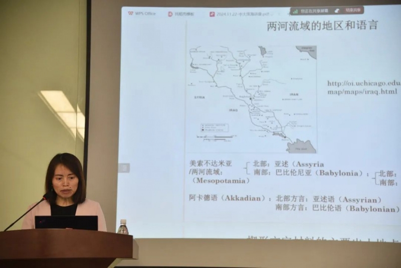 讲座伊始,欧阳晓莉教授介绍了本次讲座主题的文明背景知识——两河流域文明。两河流域文明发源于底格里斯河与幼发拉底河,古希腊称之为美索不达米亚。由于古今地理名词对照的空间范围大部分在伊拉克地区,所以也可以称为古代伊拉克文明。两河流域文明在整个西亚形成了自己的文化圈。