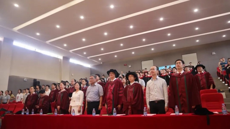 我系2022级本科生黄秋雲、陈杜谖、覃僖麟同学作为主持人,拉开了毕业大会的帷幕。在主持人的带领下,全体师生共同起立,奏唱国歌和校歌。