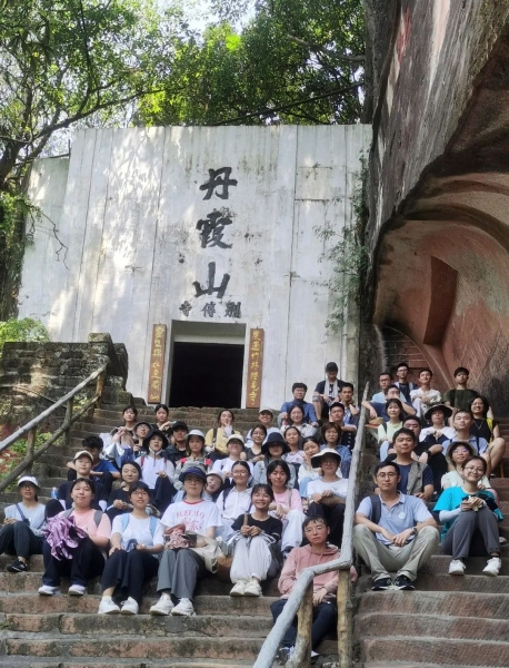 今日的考察活动从丹霞山开始。丹霞山国家地质公园是世界自然遗产。山内有丰富的文物古迹。清康熙元年(1662年),广州海幢寺澹归禅师来山开辟道场,取禅宗“不立文字,教外别传”之意,名曰“别传禅寺”。上午9时左右,同学们抵达丹霞山开始攀登,途中首先遇到一座三级八面,名唤“普同”的佛塔。杨晓东老师向大家介绍,该塔筑于南明,因其纳亡僧之骨于一处,故名 “普同”,是彼时此地僧团规模的见证。