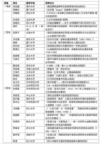 第十三届“全国史学新秀奖”论文评选活动共收到参赛论文213篇,经过评选委员会三轮严格评审,优中选优,最终评选出一等奖2名,二等奖11名,三等奖17名。