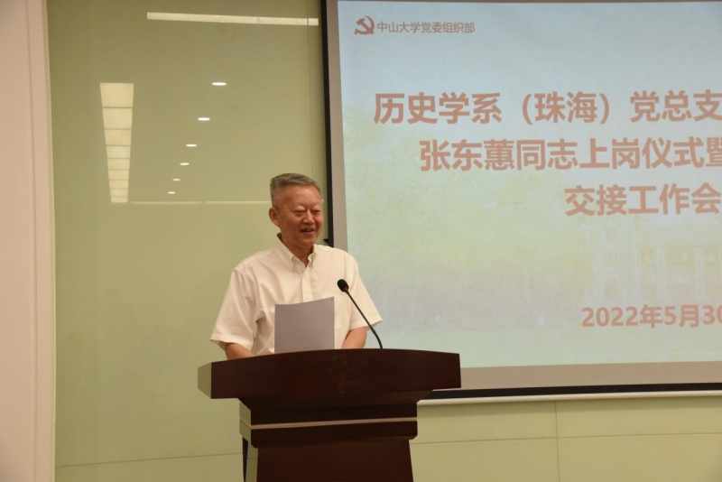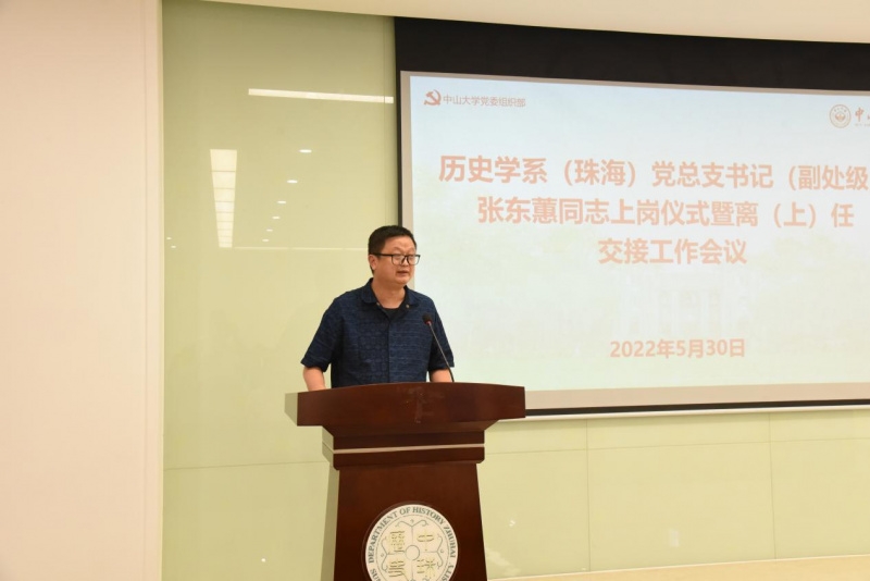 2022年5月30日上午,历史学系(珠海)在珠海校区海琴六号A326报告厅召开党总支书记上岗仪式暨离(上)任交接工作会议,校党委书记陈春声、党委组织部部长杨晓萌出席,全系教职员工参加会议。会议由系主任吴滔主持。