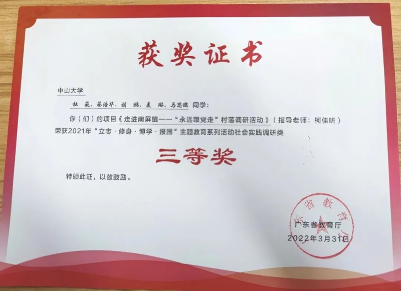 根据《广东省教育厅关于开展2021年“立志·修身·博学·报国”主题教育系列活动的通知》,省教育厅2021年面向全省高校,以“立志·修身·博学·报国”为主题,开展了社会实践调研、宣讲诵读等活动,全省各高校精心组织,广大师生积极参与,涌现出一批优秀活动成果。我系由柯佳昕老师指导,杜薇、蔡浩华、刘鹏、麦琳和马思邈同学共同参与的社会实践调研类项目《走进南屏镇——“永远跟党走”村落调研活动》荣获三等奖。