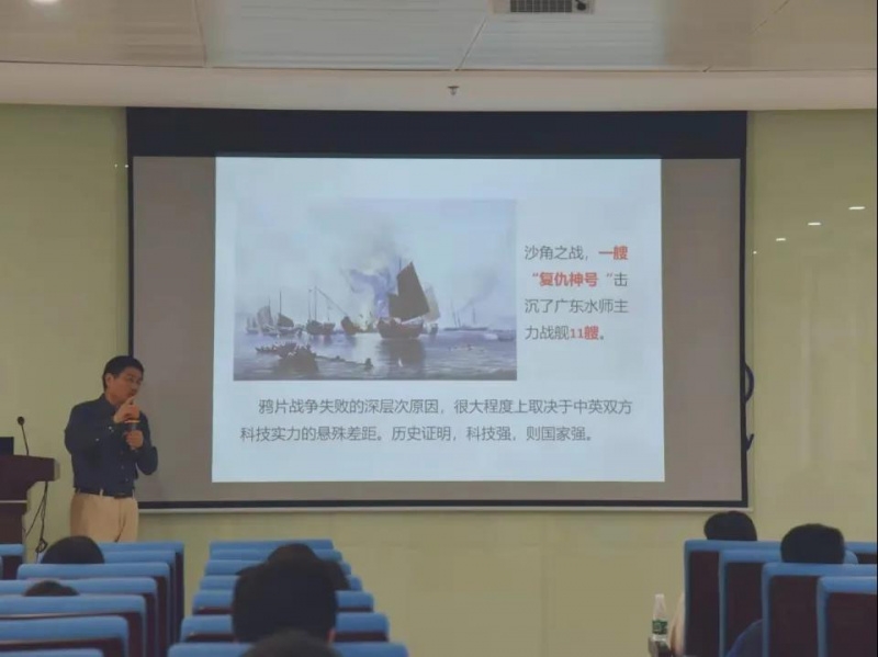 讲座伊始,张建雄老师分析了鸦片战争时期中英两国政治、经济、军事等各方面的概况,并对比了双方的力量差异,通过讲述鸦片战争中发生的重要历史事件来分析清朝失败的原因,从而得出了四大启示。