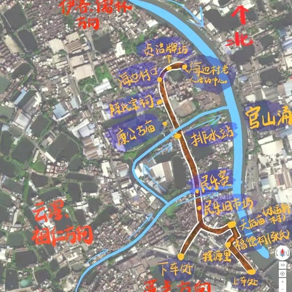 2021年10月30日,我系2019级本科生田野调查实践课程进入第三天,同学们在前两天的讨论中收获了许多田野调查的经验与方法,并跃跃欲试,准备将所学所想应用到今天的考察之中。今天的考察,我们和来自中山大学岭南文化研究院的十几名研究生汇合,在李晓龙、任建敏、陈海立和何薇等老师的带领下,前往西樵中部的民乐社区进行调查。第三天的行程主要是从藻美村开始,沿着桑园围的东段大基,途径祖仁村、民乐市和民乐窦,到海边村,最后返回民乐窦附近的水运新村。