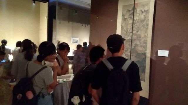 本次展览尤为珍贵的是元代王蒙《葛稚川移居图》。王蒙为元代山水画四大家之一,其同名画作曾拍出4亿高价。而本次展出的作品由故宫博物院收藏,仅借展至10月8日,弥足珍贵。该展品反映了葛洪南下岭南修道问仙的历史图景,是六朝时期中原佛道文化南渡至岭南的生动呈现,学生们长久驻足,认真观摩。